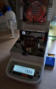 - 為了得到更精確穩(wěn)定的數(shù)據(jù)結(jié)果,在進行第二次測試過程前先等待煙絲水分儀降溫,待儀器本身溫度降至40度以下時,同樣取6克煙絲細條于不銹鋼托盤中,將煙絲細條平鋪均勻,這次我們把溫度設(shè)定在135℃,按“START”鍵開始測試,2分10秒后檢測結(jié)束,檢測數(shù)據(jù)顯示13.66%;