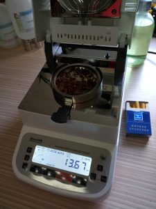- 測試煙絲細條:取6克煙絲細條置于不銹鋼托盤中,為了使測試過程中煙絲水分儀將煙絲烘干烘透,我們將煙絲攤成分散狀,以便溫度能滲透進煙絲內(nèi)部。用鑷子將煙絲細條平鋪均勻,為避免煙絲烘烤后變焦,我們將溫度設(shè)置在135℃,按“START”鍵開始測試,2分08秒后檢測結(jié)束,檢測數(shù)據(jù)顯示13.67%;
